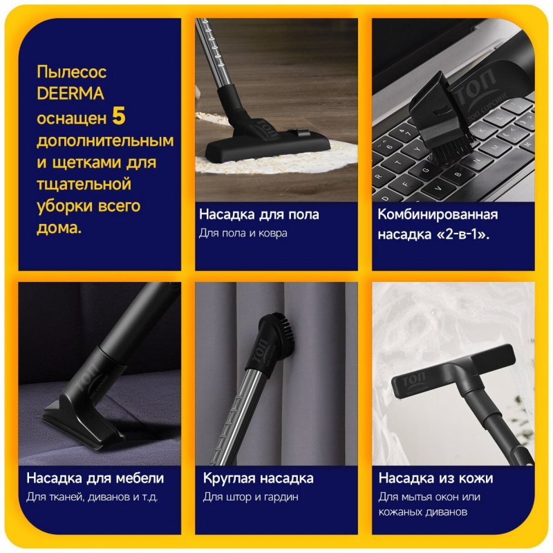 В комплекте с Deerma TJ150W идут 5 разнообразных насадок, которые сделают уборку еще более эффективной. Вы сможете легко переключаться между половой насадкой для твердых полов и ковров, щелевой насадкой с и без щетки, насадкой для мягкой мебели, круглой насадкой для занавесок и насадкой для стекол и кожаной мебели. Это значит, что ни один тип грязи не ускользнет от вашего внимания.