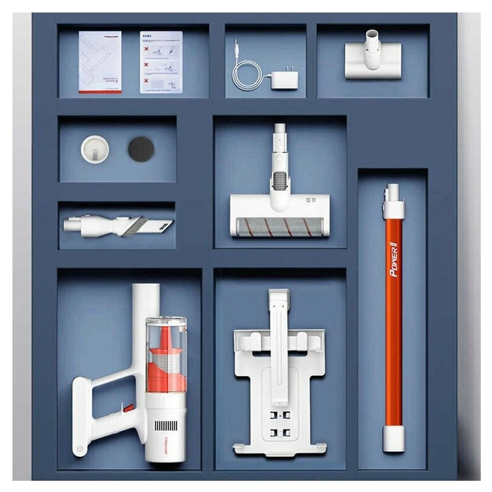 Пылесос, металлическая труба, основная электрощетка, дополнительная электрощетка, насадка для мебели, компоненты фильтра, настенный держатель для зарядки, адаптер питания |